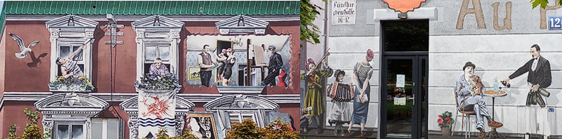 Zurück in die Gegenwart. Unser Spaziergang beginnt an der Stolpe. Der weiße Speicher beherbergt heu-te die Sammlung von Werken des polnischen Malers Stanisław Ignacy Witkiewicz (1885–1939), der unter dem Künstlernamen „Witkacy“ bekannt ist, 260 Gemälde sind zu sehen. Weitere Reproduktionen seiner Werke finden wir auf den Außenfassaden vieler Gebäude in der Stadt. Er ein mit vielen Talenten gesegneter Künstler: Maler, Fotograf, Schriftsteller, Bühnenautor und Philosoph. Bekannt wurde Stanisław Ignacy Witkiewicz, der am 24. Februar 1885 in eine Künstlerfamilie in Warschau geboren wurde, vor allem als Bürgerschreck und Provokateur. Seine amourösen Affären mit einer viel älteren und etlichen viel jüngeren Frauen sorgten für Aufsehen. Diese turbulenten Beziehungen waren der Stoff, aus dem seine Romane sind. Lebenslang konsumierte er Drogen, um sich von ihrem positiven Einfluss auf die Kreativität zu überzeugen. Witkacy war sein eigenes Versuchskaninchen, allerdings kein Suchtkranker, denn er nahm sie immer unter ärztlicher Aufsicht. Nachdem die deutschen Truppen am 1. Septem-ber 1939 in Warschau einmarschierten, flüchtete er mit seiner Geliebten nach Ostpolen. Als er erfahren hatte, dass die Rote Armee am 17. September Ostpolen besetzte, nahm er sich einen Tag später das Leben.